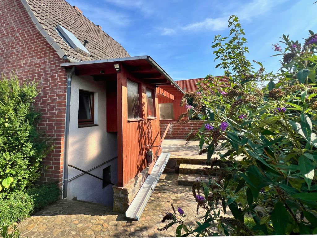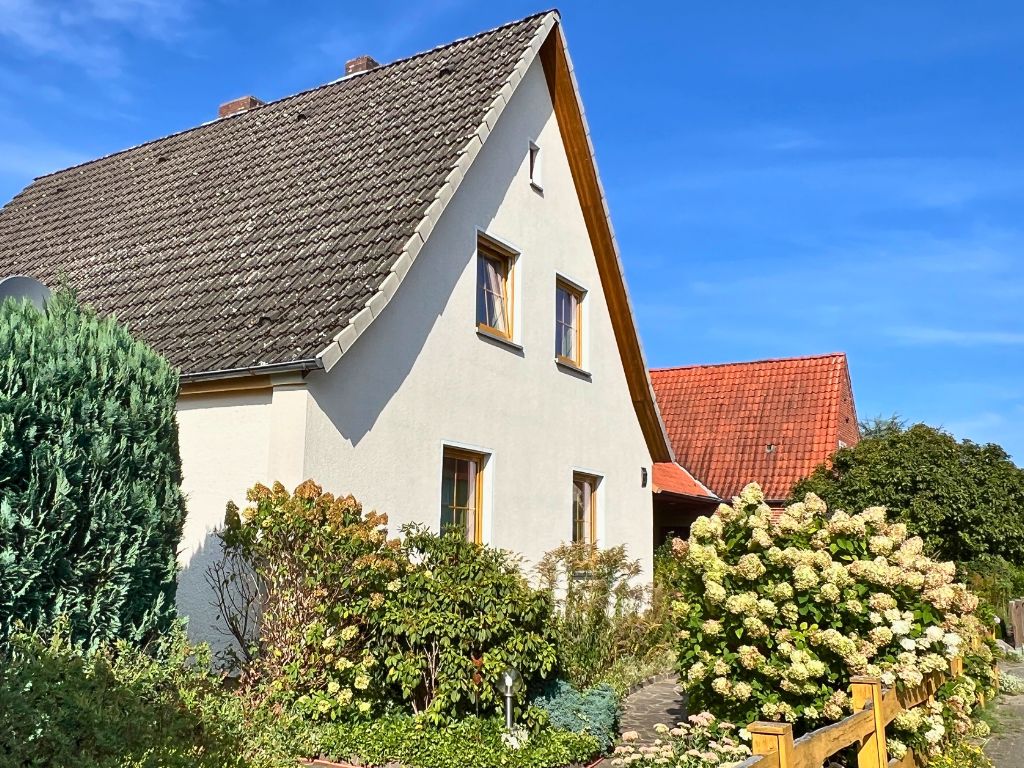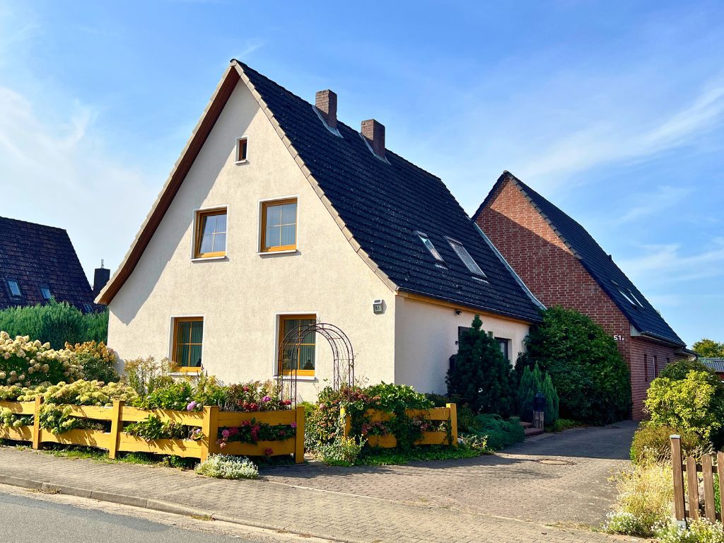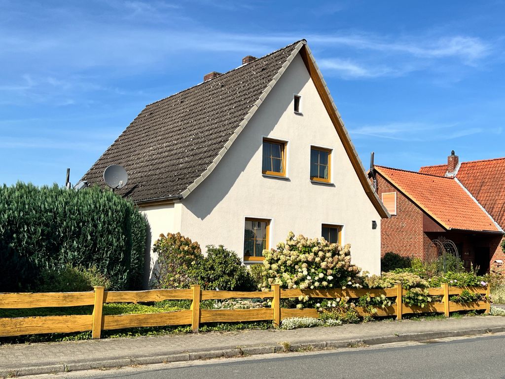 Dieses Einfamilienhaus wurde ursprünglich 1936 als freistehendes Siedlungshaus erbaut. Im Jahr 1999 wurde das Gebäude durch einen weiteren, eigenständigen Wohnhausanbau, erweitert. Zum Verkauf steht nunmehr die vordere Doppelhaushälfte, dessen Grundstück zentral gelegen, direkt an die Wrestedter Bahnhofstrasse grenzt. Mit einer Wohnfläche von rund 120 m², bietet das Haus auch Familien mit Kindern ausreichend Platz. Die fünf Zimmer des Hauses verteilen sich auf Erdgeschoss und das voll ausgebaute Dachgeschoss. Im Erdgeschoss stehen auch Küche und ein erst 1990 neu entstandenes Bad zur Verfügung. Bemerkenswert ist, das der Südgiebel des Gebäudes schon 2006 mit einem Wärmeverbundsystem nachgerüstet wurde. Die Dacheindeckung wurde 1989 vollständig erneuert und auch die Fenster wurden seither nach und nach ausgetauscht.